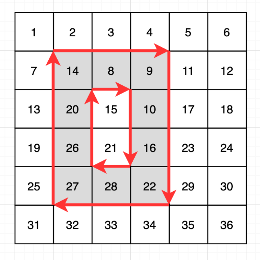 - x1 행 y1 열부터 x2 행 y2 열까지 영역의 테두리를 시계방향으로 회전한다는 뜻입니다.
